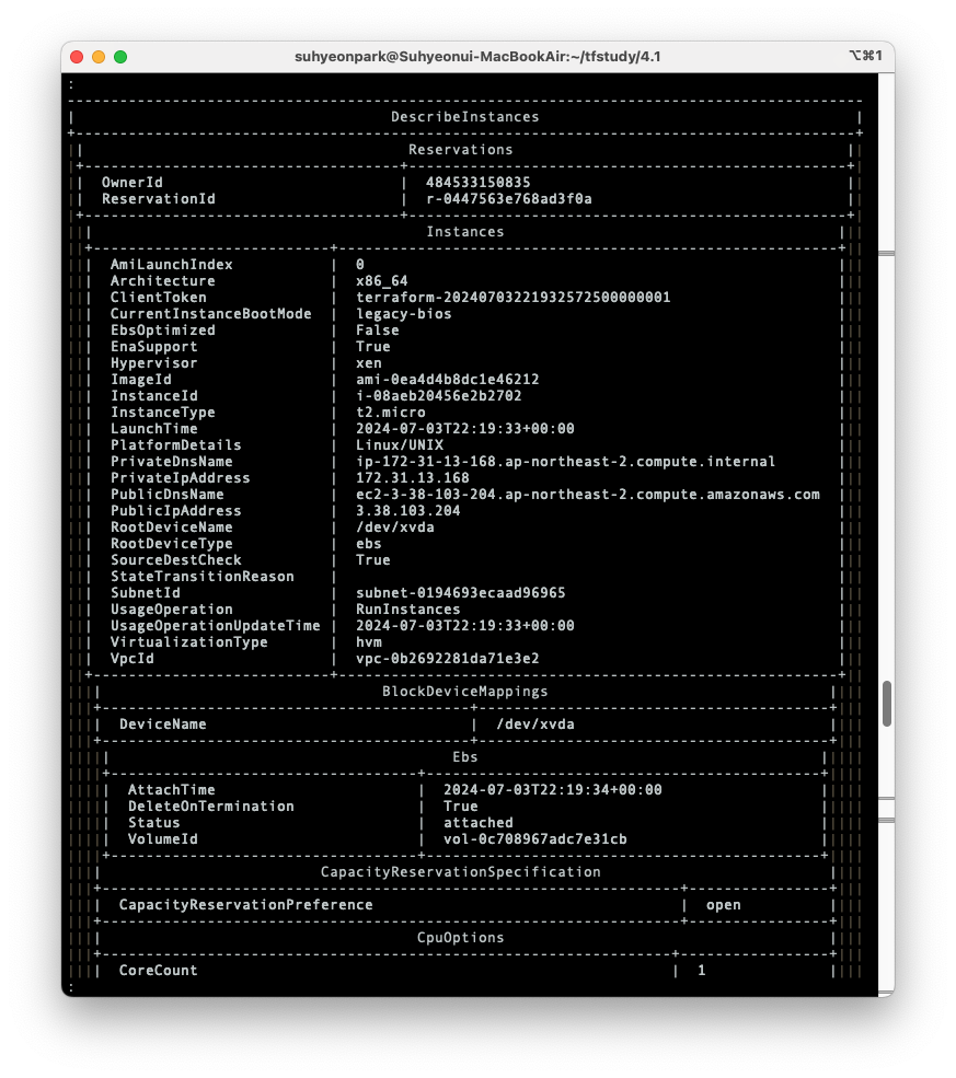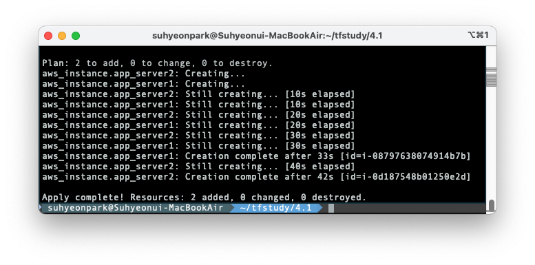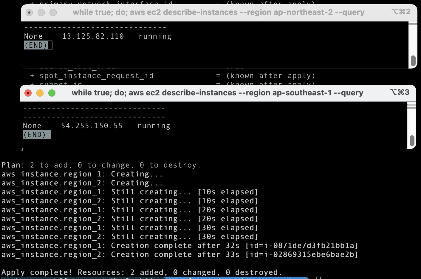 plan & apply 를 적용할 때 별도의 터미널에서 모니터링 코드를 띄워놓으면 각 리전에서 ec2가 배포되는 것을 확인할 수 있다.