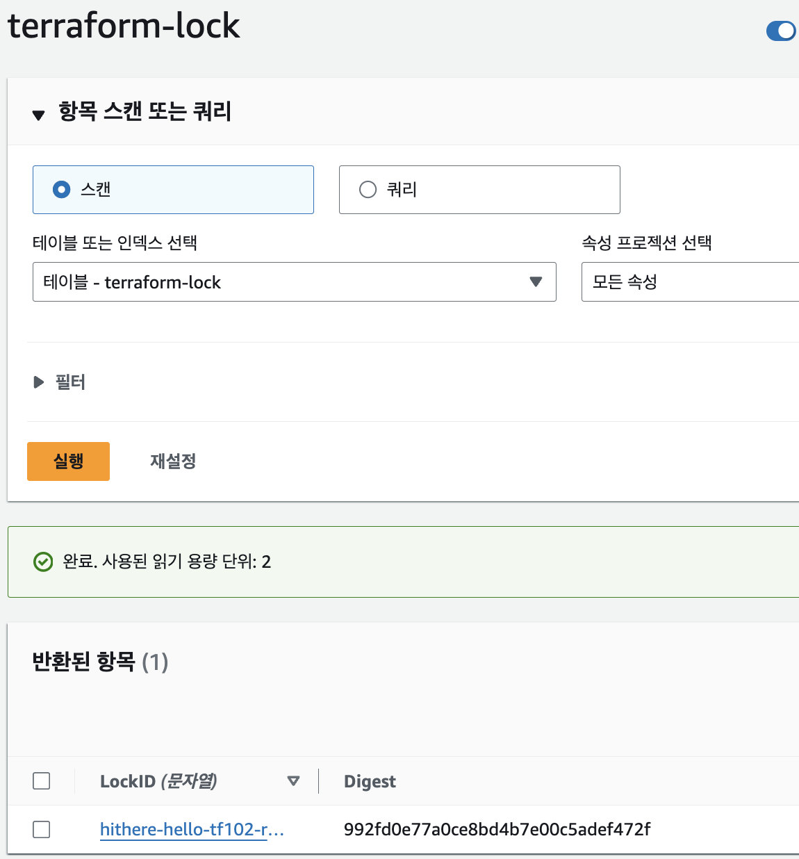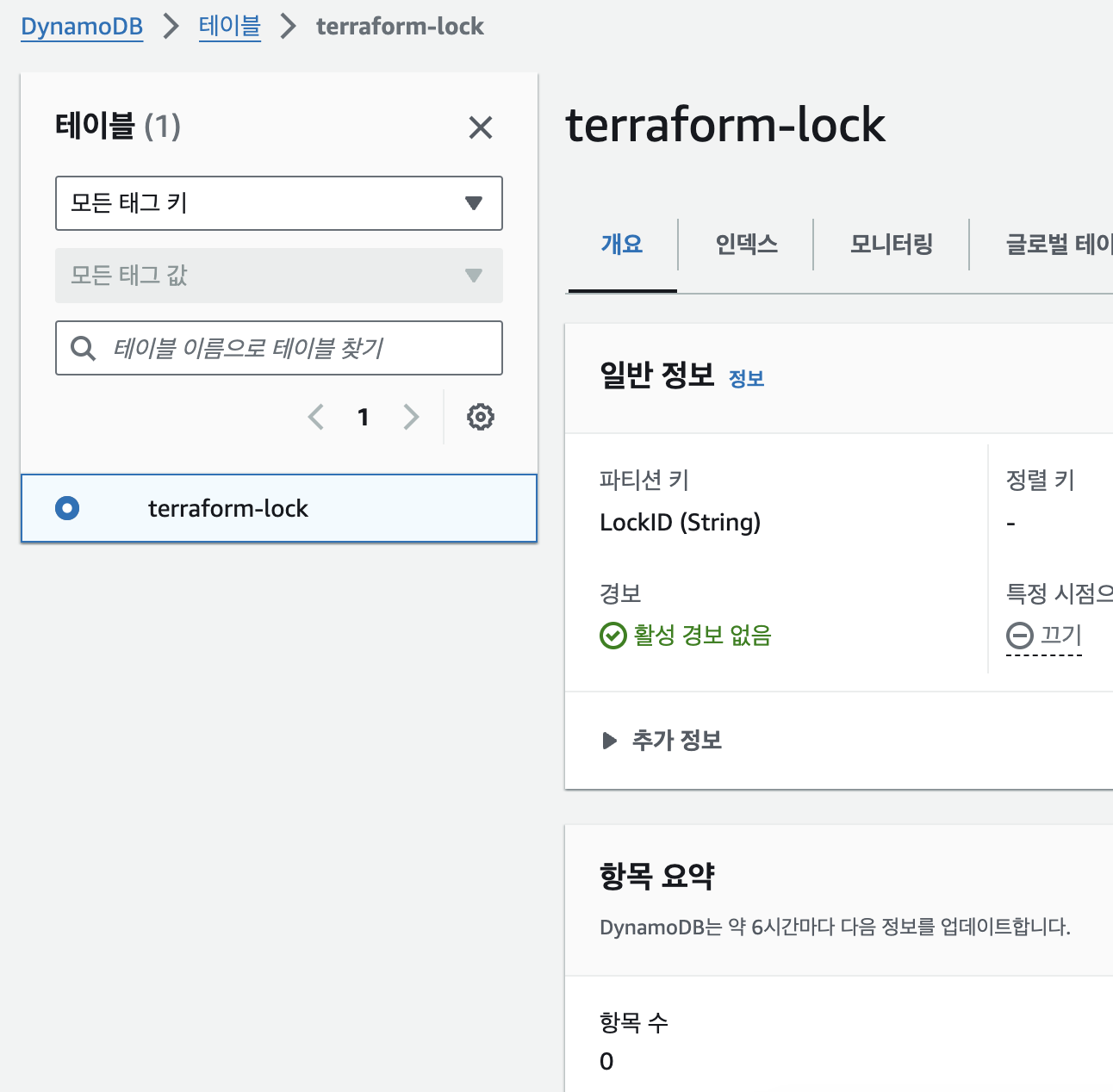 aws web console 에서 각각의 상태를 볼 수 있다. 현재까지는 한번도 state에 수정이 일어나지 않았기 때문에 s3에는 1개의 tfstate file이 있고 dynamodb는 비어 있다.