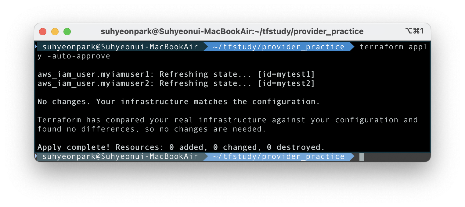 terraform 에서 멱등성이 지켜지는지를 확인하기 위해 다시한번 apply 를 실행해보면, "No changes. Your infrastructure matches the configuration" 메시지가 뜨면서 아무 일도 일어나지 않는다.