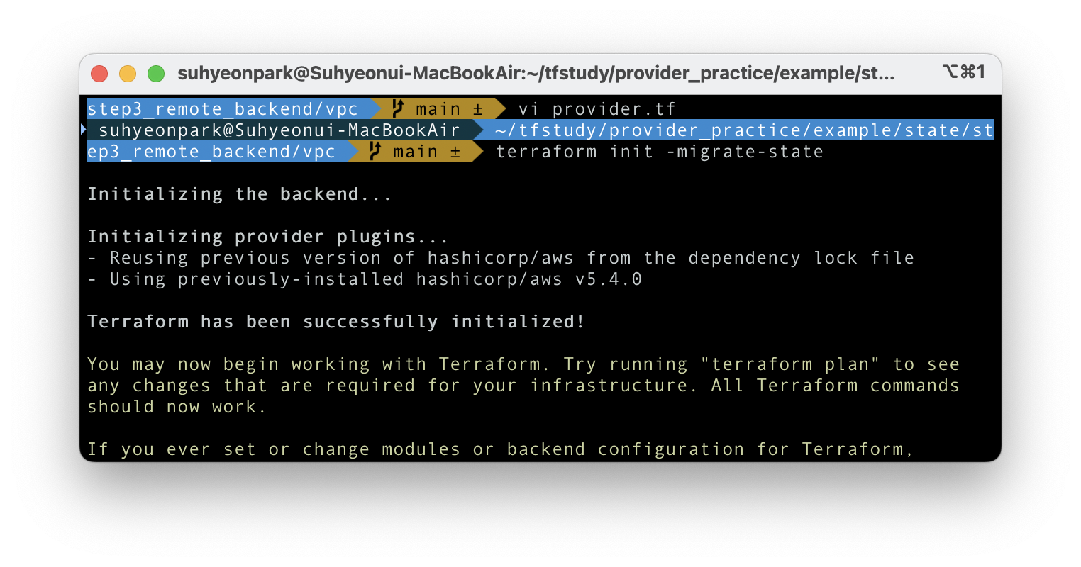 배포된 dynamodb를 lock 용도로 사용한다는 것을 vpc의 provider을 수정해서 명시한다. 처음으로 -migrate-state라는 옵션을 줘서 새로 백엔드를 명시하되 기존의 state 내용을 이관해 오게 된다.