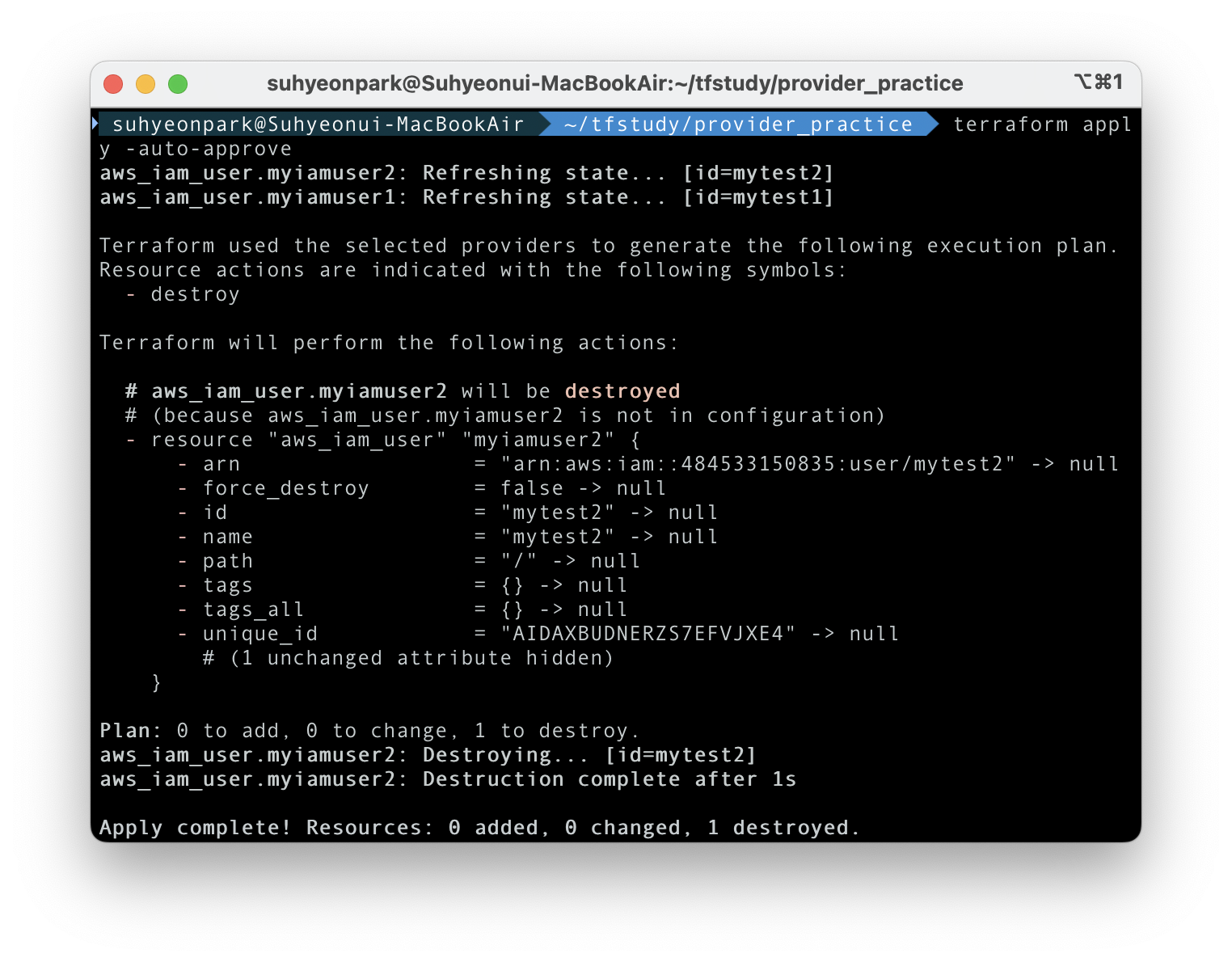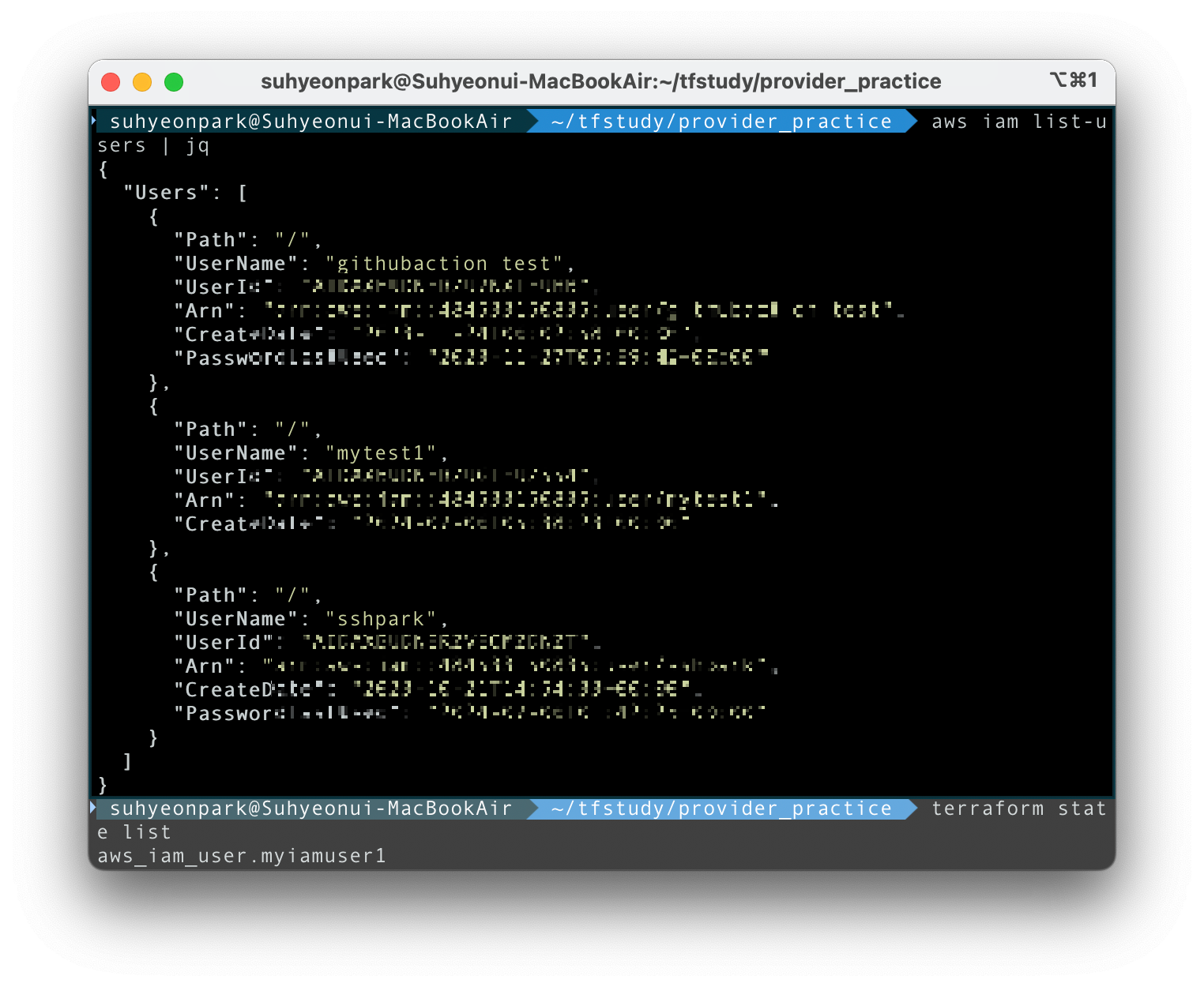terraform state show aws_iam_user.myiamuser1 #개별 리스트에 대한 자세한 정보 확인