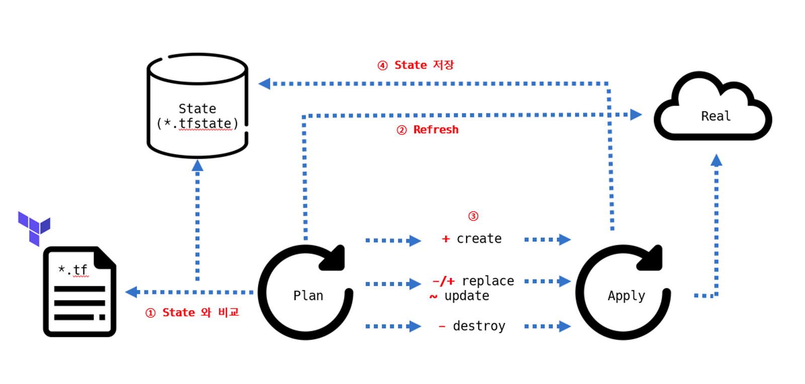 terraform 은 아래 그림과 같이 기존 state 와 구성을 비교해 실행 계획에서 생성/수정/삭제 여부를 결정한다.