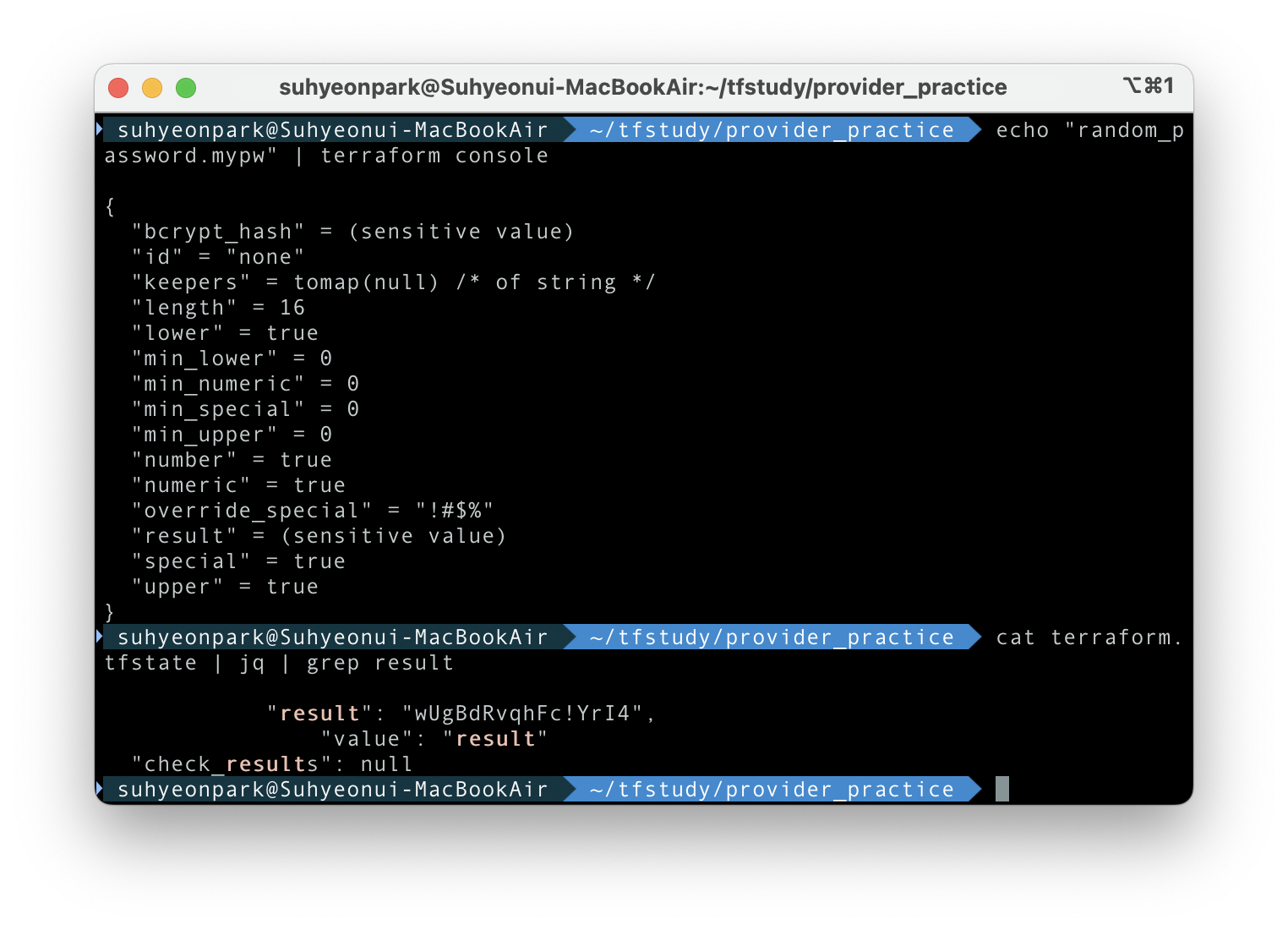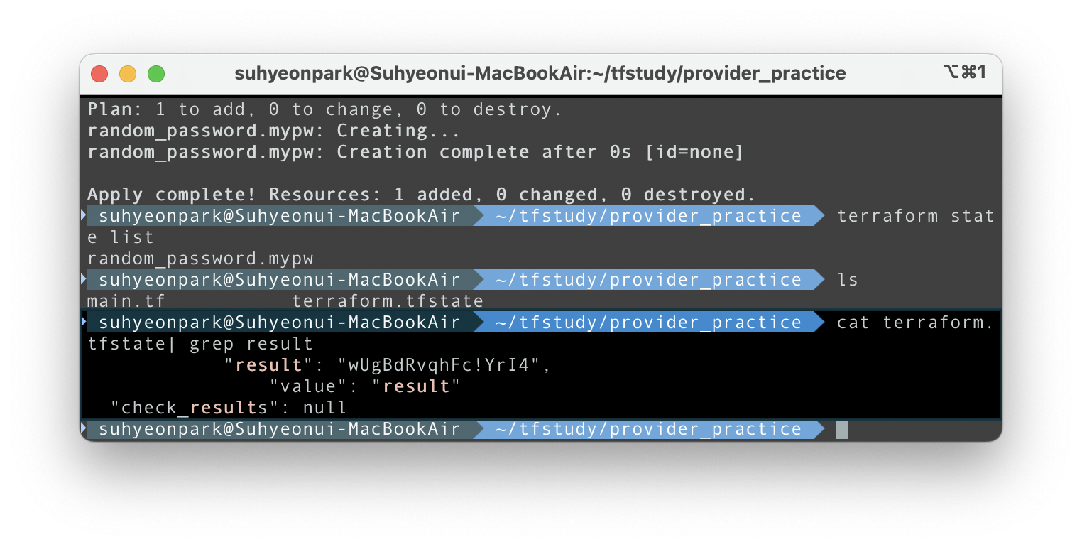 마찬가지로 terraform init && terraform plan && terraform apply -auto-approve 로 수행하면 아래와 같이 값이 생성됨을 볼 수 있다. 하지만 별도 파일이 생성되는 게 아니라 terraform state file 내부에 저장된다.