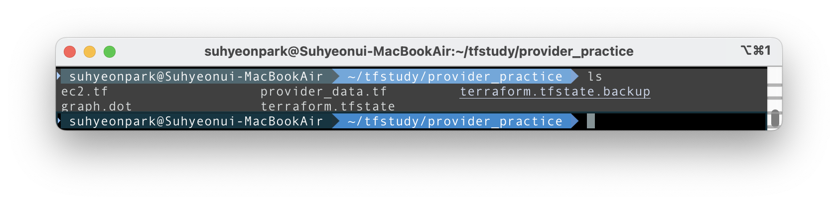 테라폼의 멱등성을 보장하기 위해 테라폼은 state file을 운영한다. 앞의 provider 실습을 진행한 폴더에 들어가 보면 terraform.tfstate 와 terraform.tfstate.backup 파일 2개가 생성되어 있다.