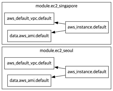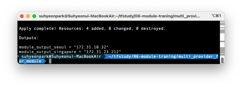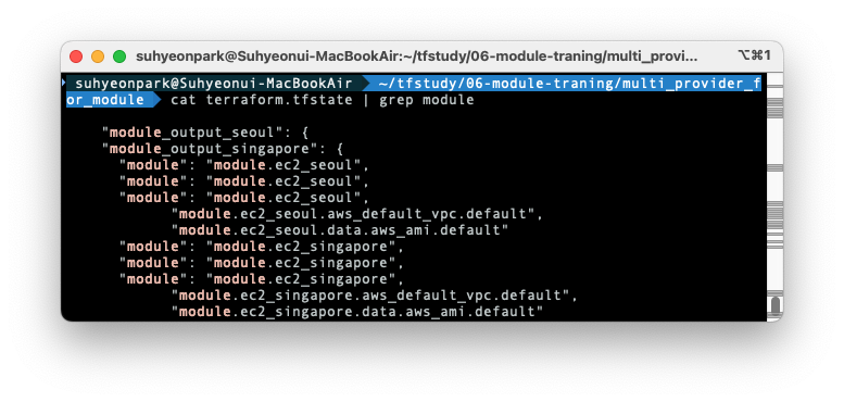 루트모듈의 main.tf 는 차일드모듈을 가져다가 사용하는데, 2개의 프로바이더를 사용했다(같은 ec2 다른 리전). 이때 사용하는 소스는 동일하게 차일드 모듈의 테라폼 파일을 가져다가 서울/싱가폴 리전에 각각 ec2와 vpc 를 생성한다.