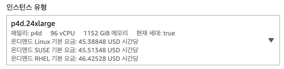 서울 리전에서 가장 비싼 인스턴스인 p4d.24xlarge를 예시로 들어보겠습니다. A100(VRAM 40GB) GPU 무려 8장이 붙어있는 인스턴스입니다. 그만큼 가격도 대단해서 온디맨드로 요청하면 시간당 $45가 부과됩니다💸