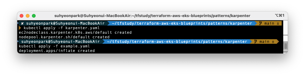 클러스터에 karpenter와 example Deployment 를 배포해 줍니다