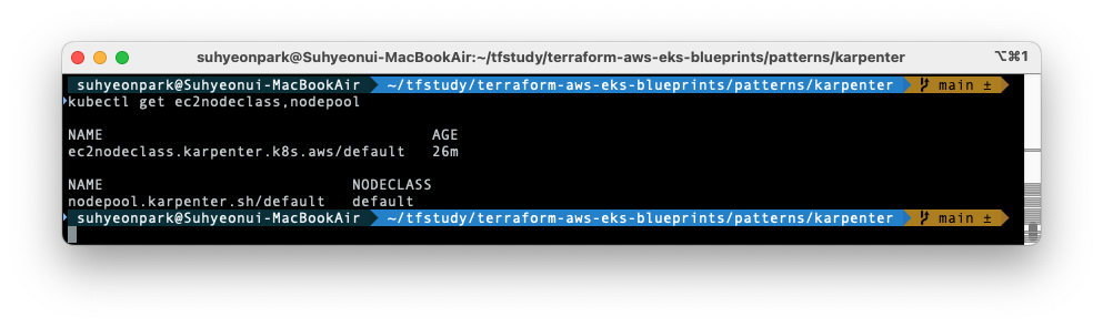 karpenter 가 관리하는 nodepool과 ec2nodeclass 가 잘 배포되었음을 볼 수 있습니다.