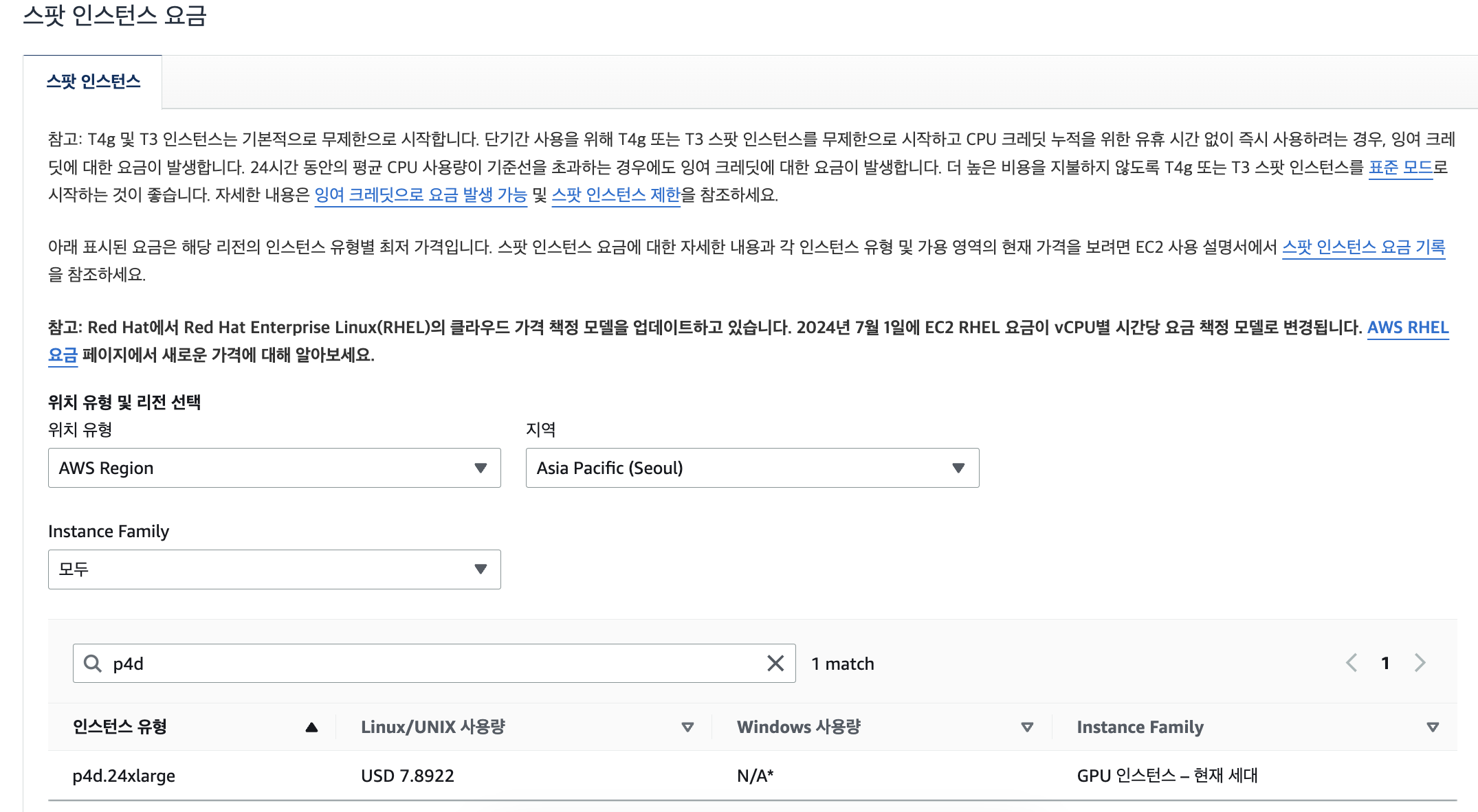 그러나 스팟인스턴스로 요청하면, 요금이 시간당 $7.9로 확 낮아지게 됩니다(대신 내가 원할 때 사용할 수 있다는 보장은 없습니다)