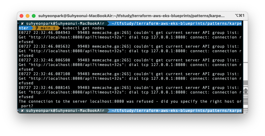 +DEBUG 이전/이후의 노드 개수를 확인해보기 위해 kubectl 명령어를 쳤는데 클러스터에 접근할 수 없다는 에러메시지가 발생했습니다. 분명히 클러스터를 배포했는데 다른 kubectl 명령어도 먹히지 않아 확인해보니 EKS가 아닌 로컬 클러스터에서 kubectl 명령어를 실행하려고 하니 발생하는 문제였습니다