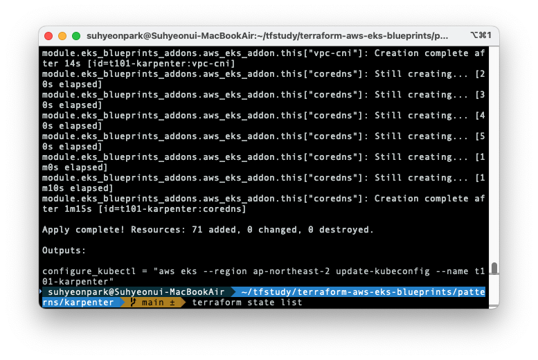 따라서 cli에 아래 명령을 입력해주어 t101-karpenter 로 kubectl 명령어가 들어가게 설정했습니다.