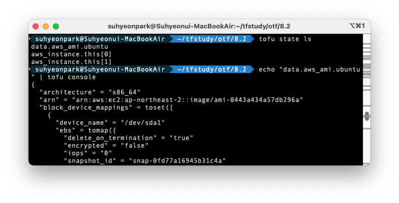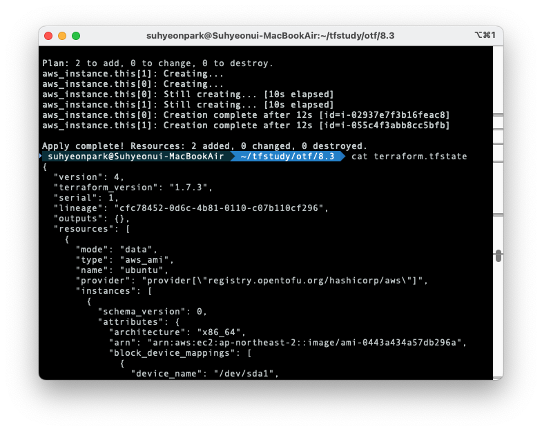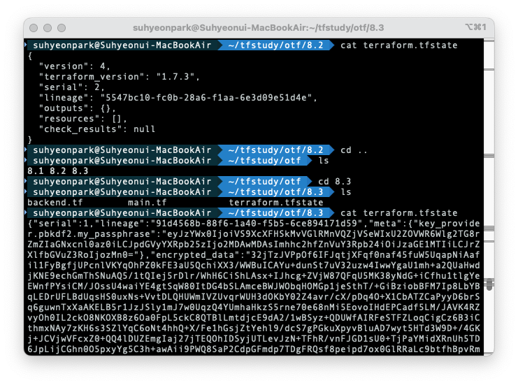 다시 tofu apply -auto-approve후 terraform.state 를 확인하면 다시 평문으로 돌아온 것을 확인할 수 있습니다