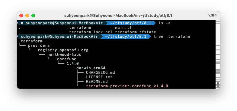 tree 명령어로 찍어보면 terraform 과 동일하게 state, provider 가 생성되어 있습니다. provider에는 위에서 사용한 northwood-labs 의 프로바이더가 들어와 있습니다.