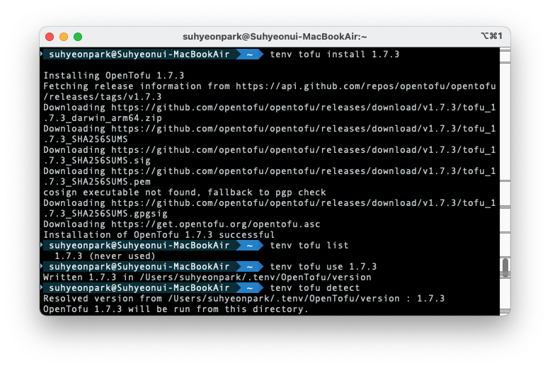 install -> use -> detect 모두 실행하면 버전이 잘 나오고 tofu를 실행할 준비가 되었습니다